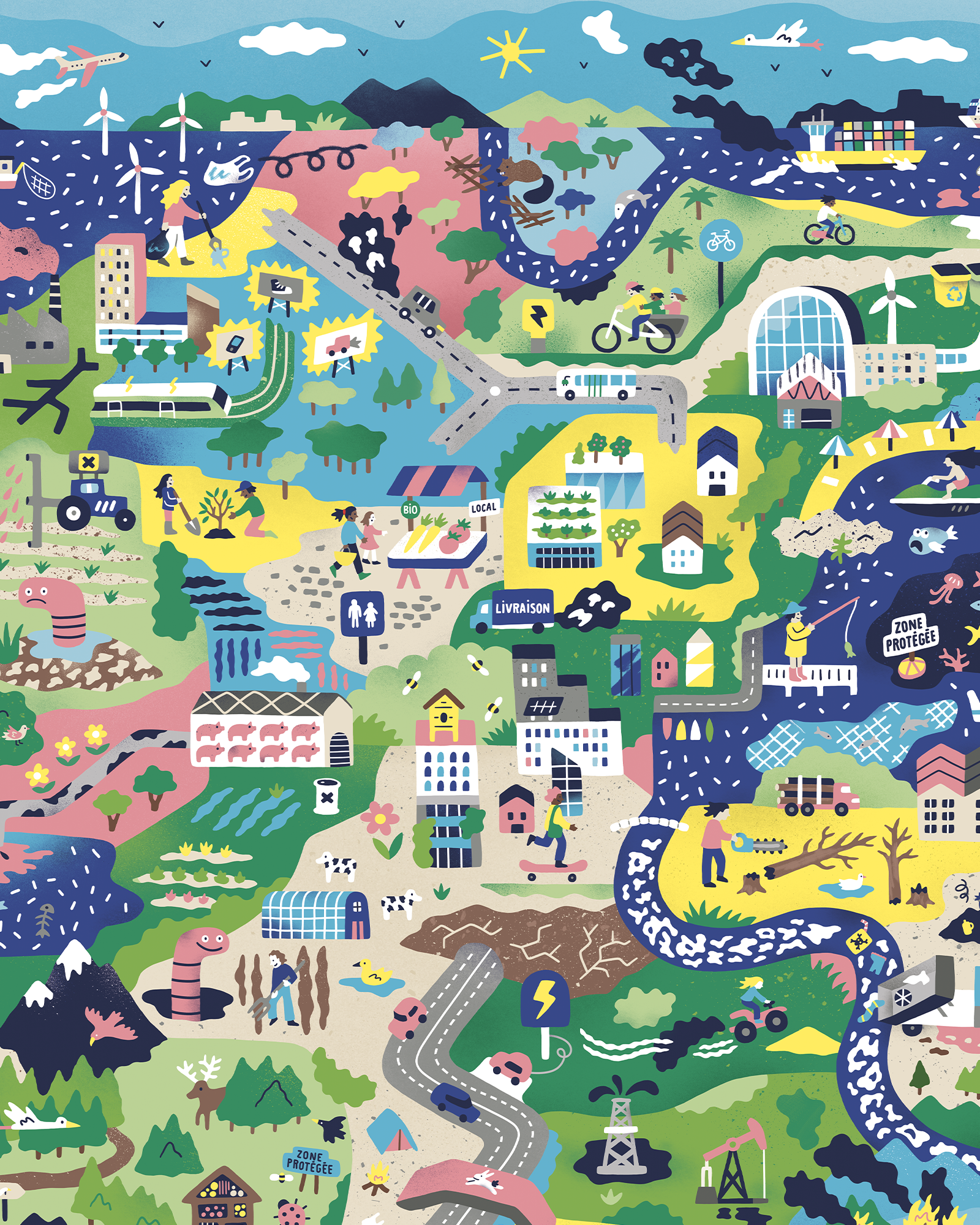 La Caisse d’Épargne est un groupe bancaire français. J’ai illustré un livret-jeu pour le lancement d’une offre de compte d’épargne dédiée au financement de projets écologiques.